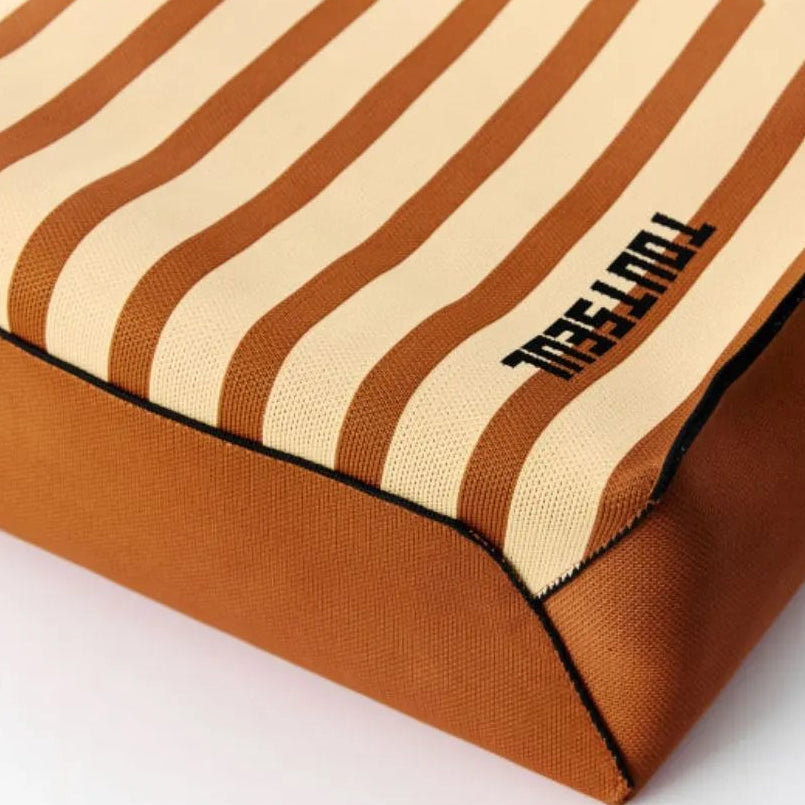表のアートと裏のストライプが目を惹く、存在感たっぷりのトートバッグ。
