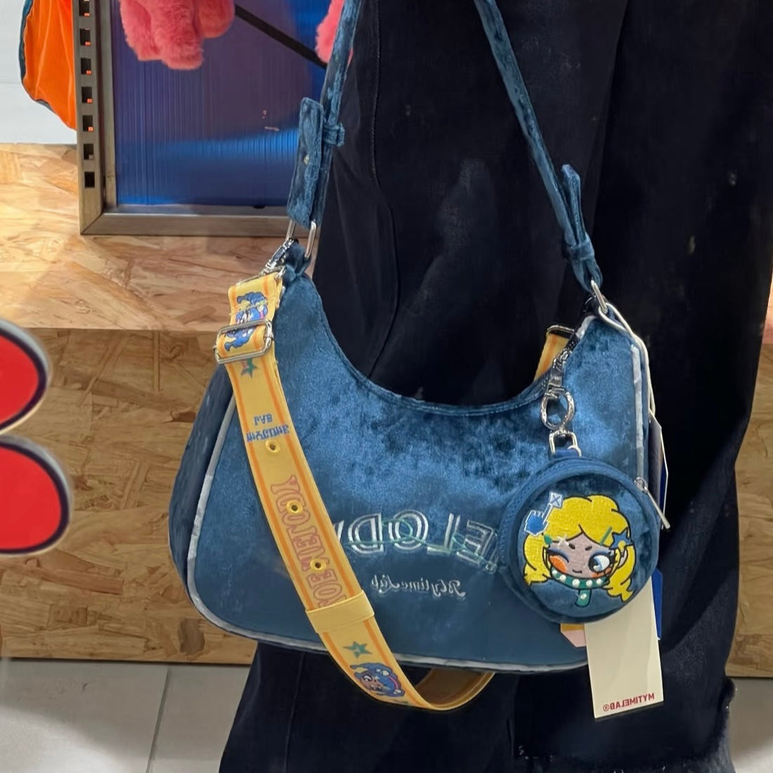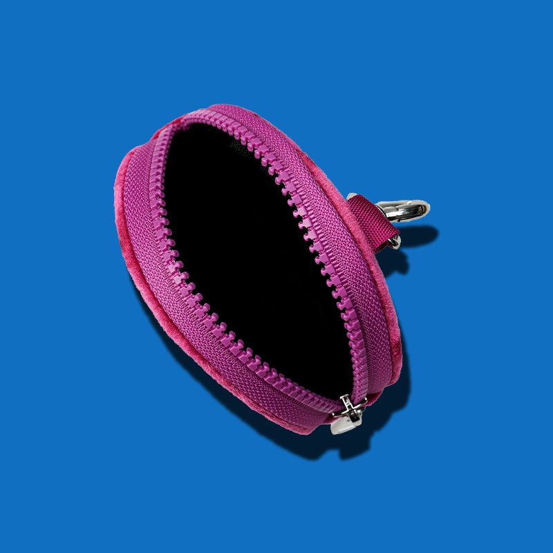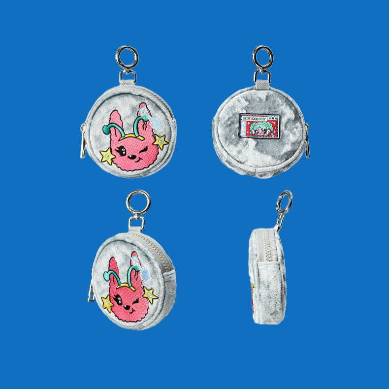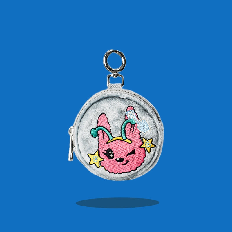 ツヤのある生地にキャラクター刺繍が映える、ポップでキュートなラウンドポーチ。