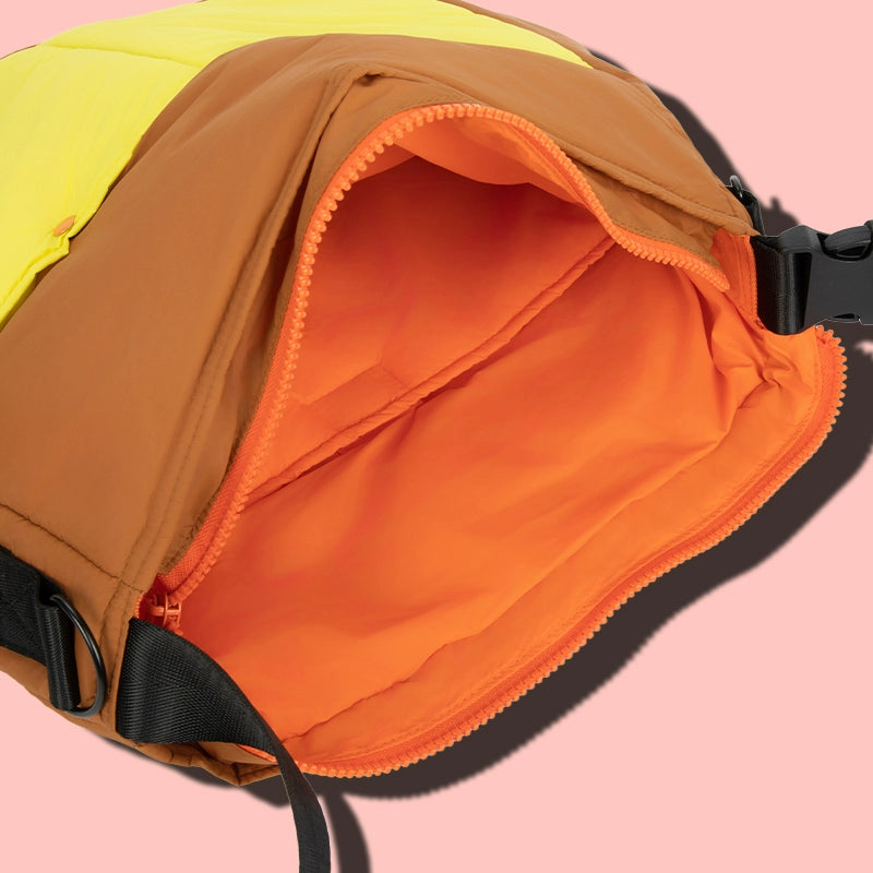 グリーン×パープル、ブラウン×イエロー、ミルクティー×ブルーのカラフル3色展開で、持つだけでコーデが一気に元気に。