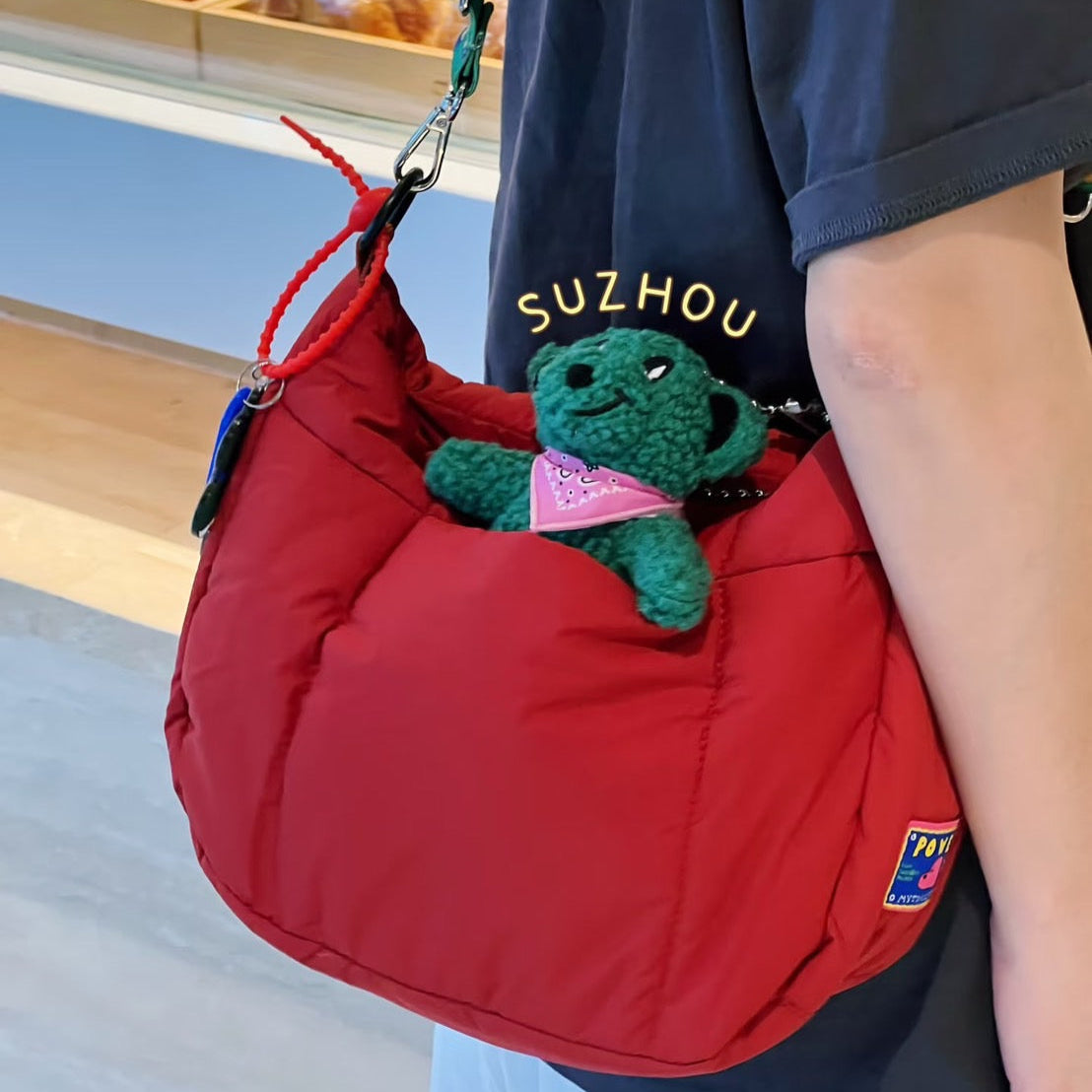 ポップなカラーとふわっとしたキルティングデザインが目を惹くショルダーバッグ。小ぶりなサイズ感なのに、スマホやお財布、リップなどのお出かけ必需品がすっきり入ります。軽量ナイロン素材で持ちやすく、デイリーから旅行、フェスまで幅広く活躍。鮮やかな5色展開で、コーデの差し色にもぴったりなアイテムです♪