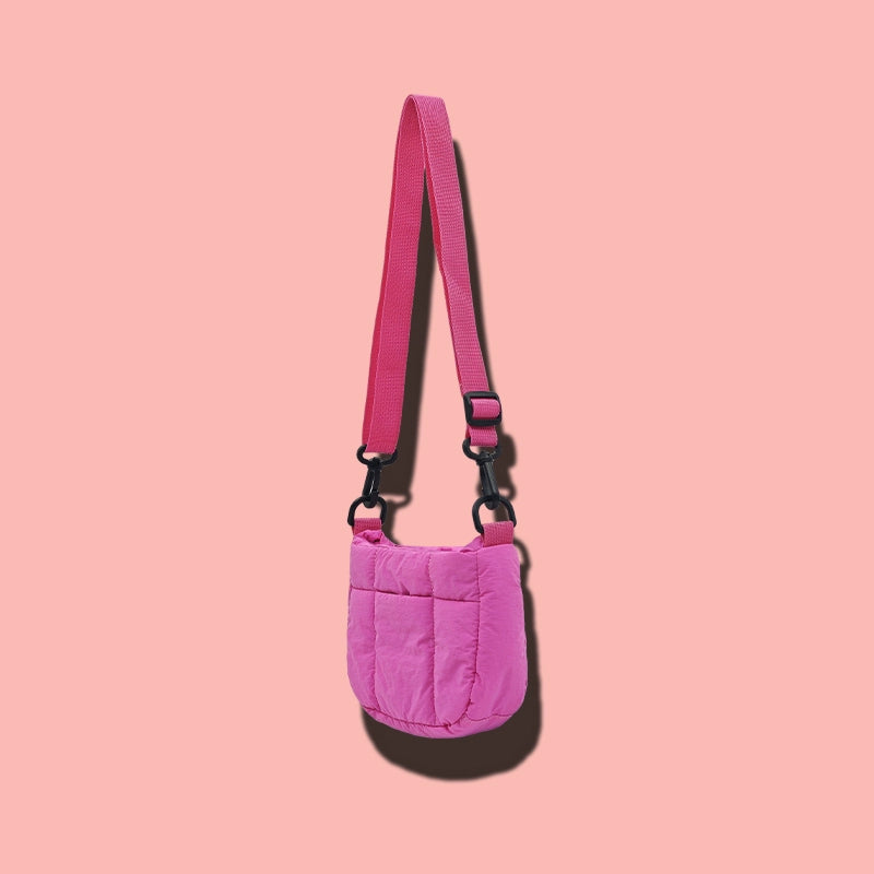 ポップなカラーとふわっとしたキルティングデザインが目を惹くショルダーバッグ。小ぶりなサイズ感なのに、スマホやお財布、リップなどのお出かけ必需品がすっきり入ります。軽量ナイロン素材で持ちやすく、デイリーから旅行、フェスまで幅広く活躍。鮮やかな5色展開で、コーデの差し色にもぴったりなアイテムです♪
