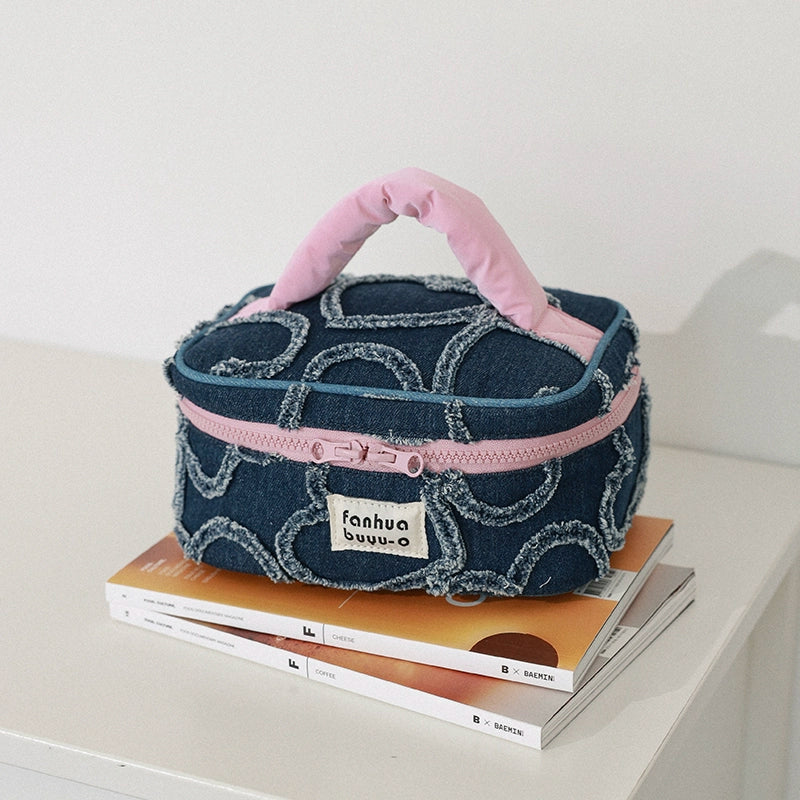 ふんわりフリンジのハートステッチが目を惹く、デニム素材のボックスポーチ。