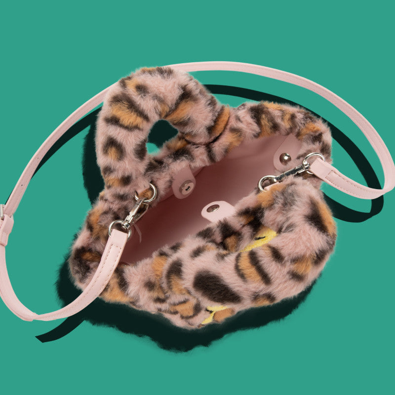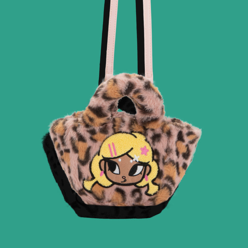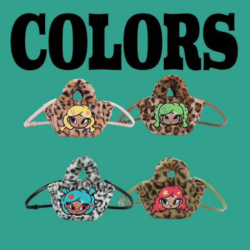 ひょう柄×ふわもこ素材でインパクト抜群のファーバッグ。大胆なキャラクターワッペンがポップな遊び心をプラスします。ショルダーとハンドの2WAY仕様で、コーデに合わせて使い分け可能。秋冬スタイルのアクセントにおすすめです♪