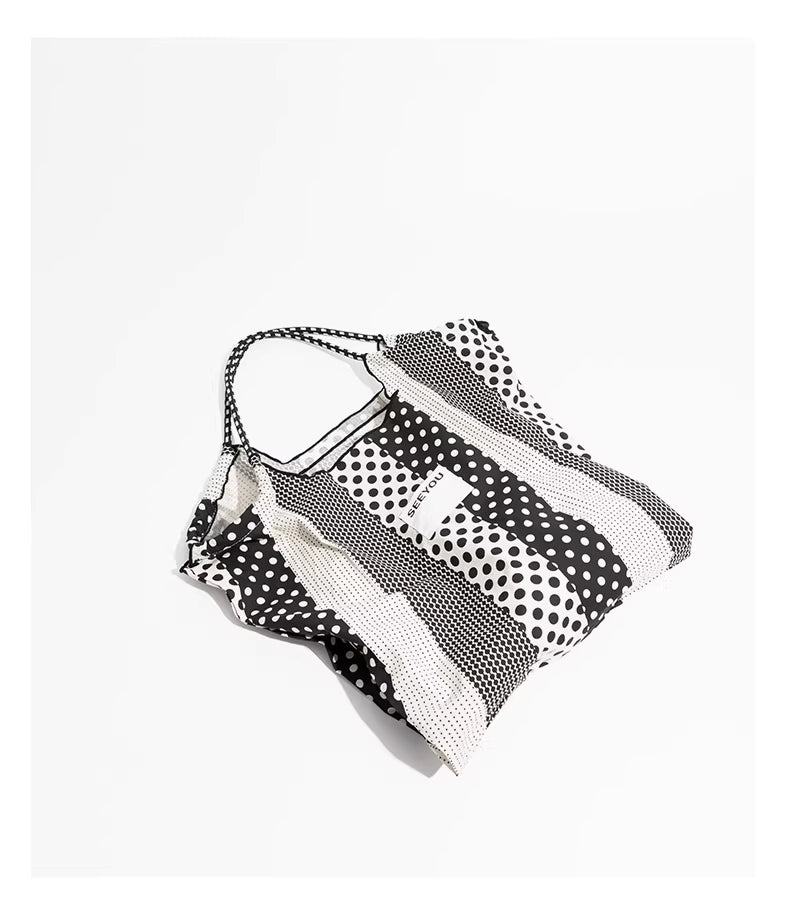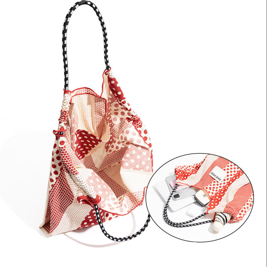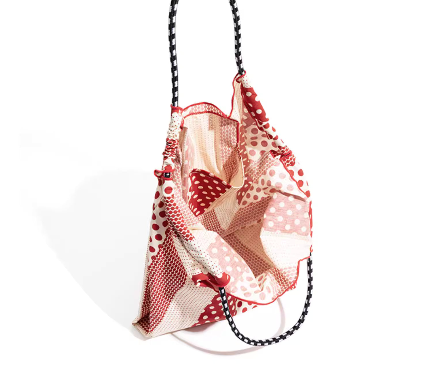 レッド×ドット柄が目を惹く、ポップで遊び心のあるナイロントートバッグ。軽量なナイロン素材を使用し、