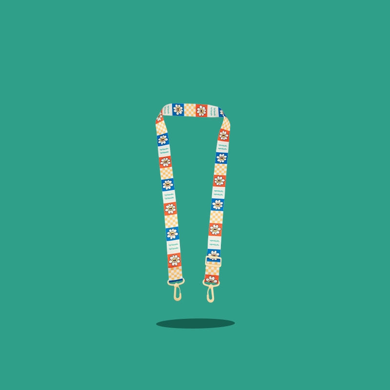 チェッカーパターンとフラワーモチーフが目を引く、カラフルなショルダーストラップ。