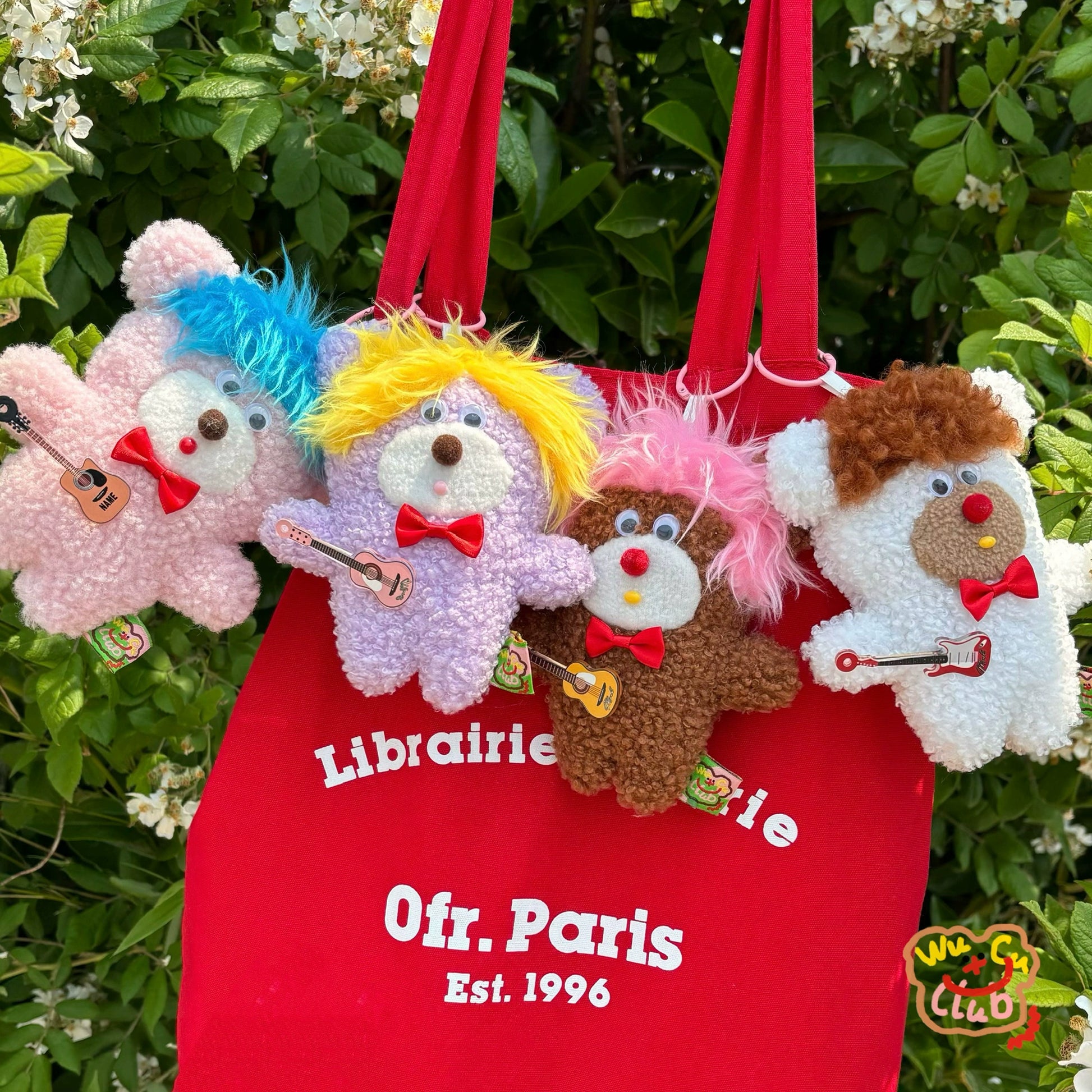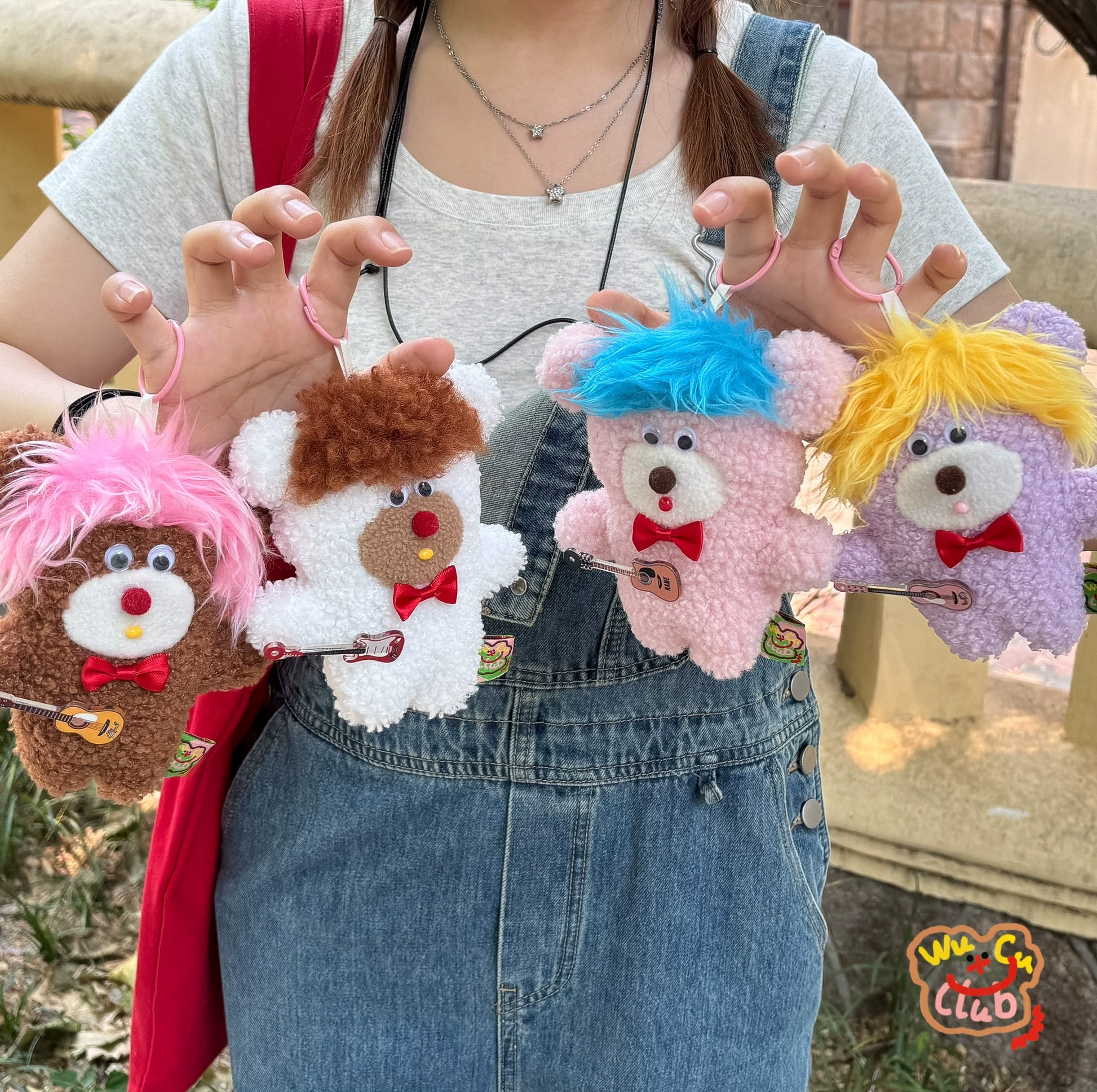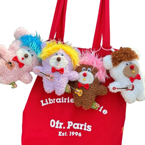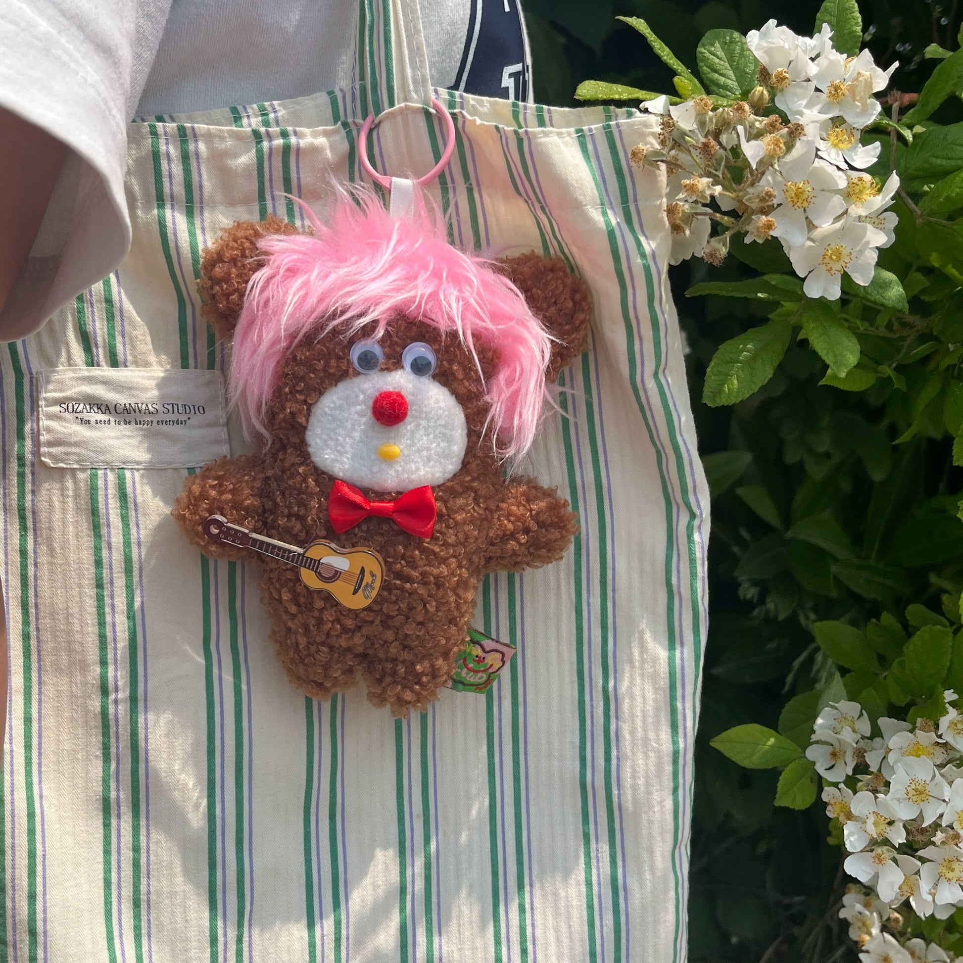 ポップでユーモアあふれる「ロック・ベア・チャーム」が登場!ふわふわのボア素材で作られたクマたちが、カラフルな髪型と赤い蝶ネクタイでおめかし。さらに手にはミニギターを抱え、まるで小さなロックスターのような存在感です。