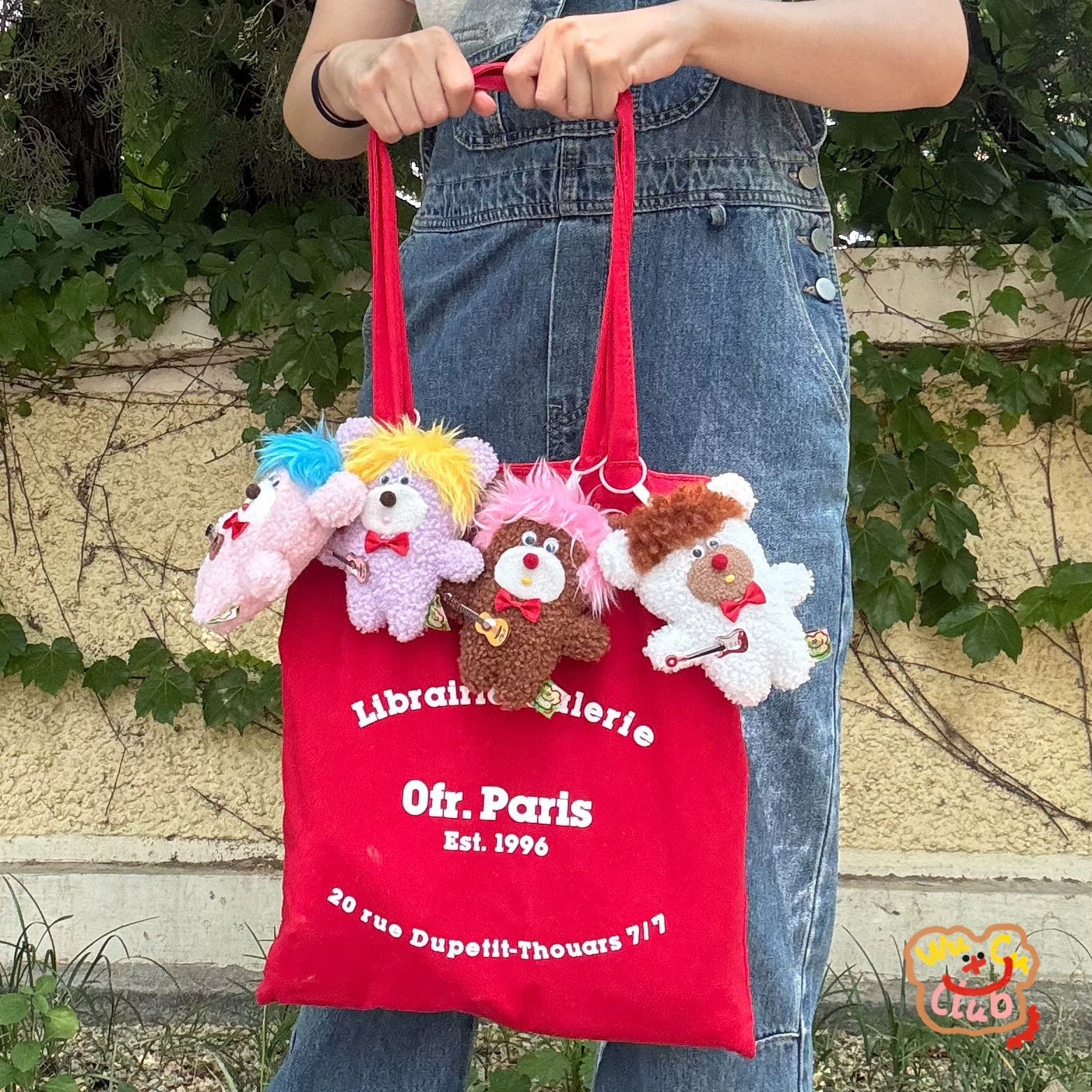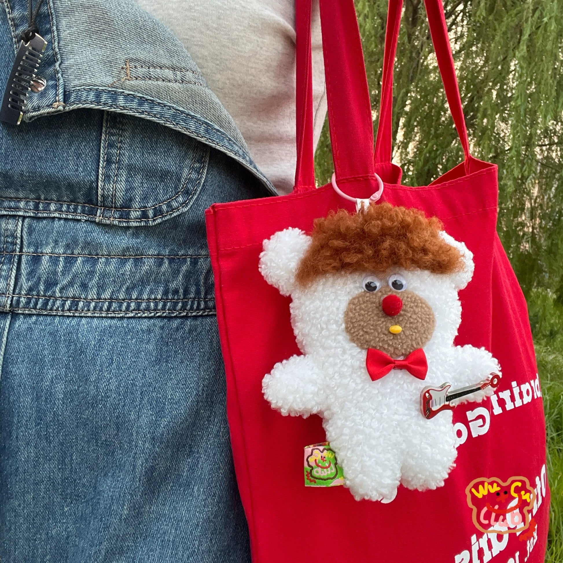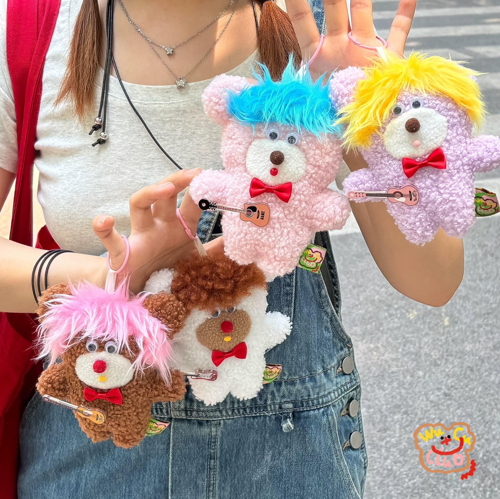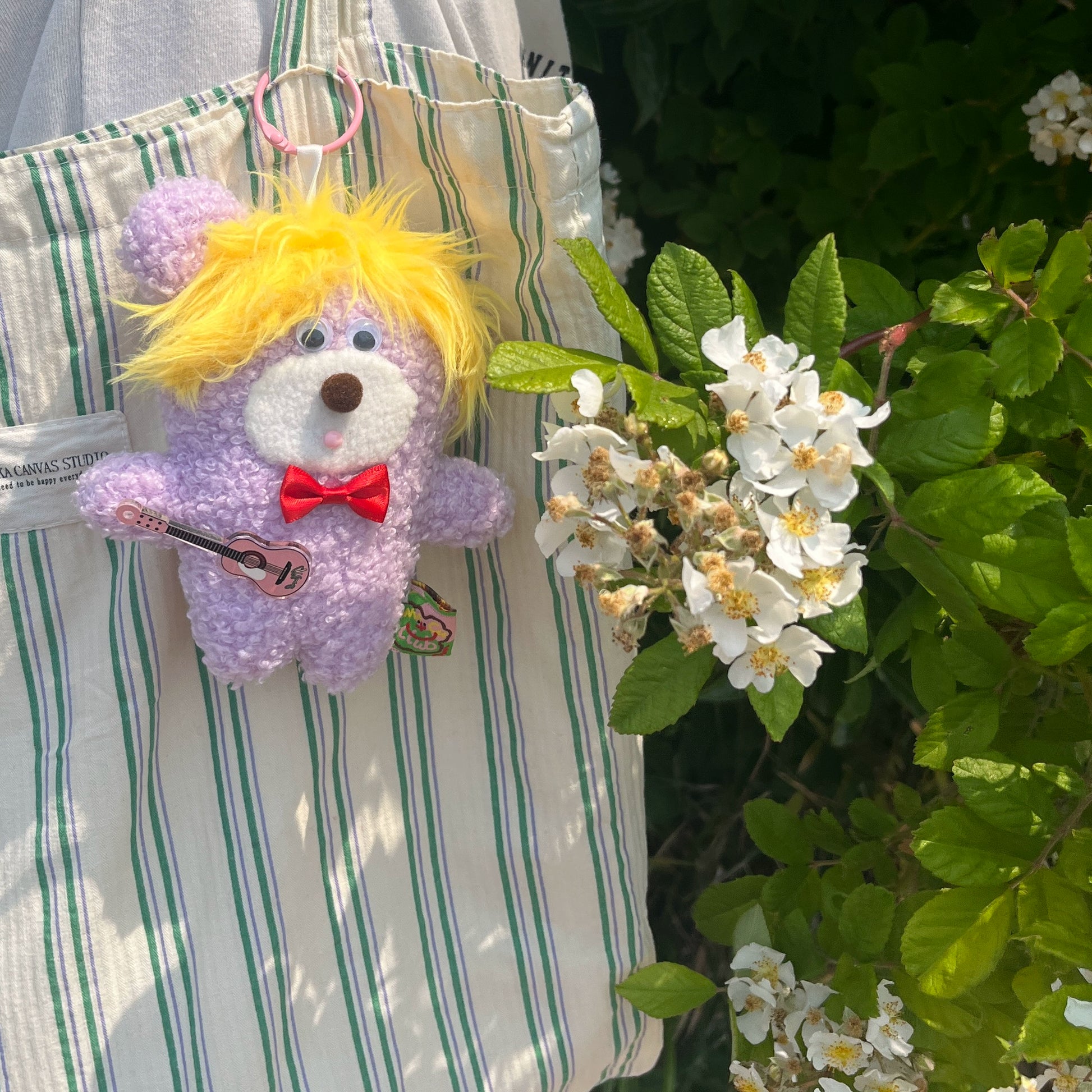 ポップでユーモアあふれる「ロック・ベア・チャーム」が登場!ふわふわのボア素材で作られたクマたちが、カラフルな髪型と赤い蝶ネクタイでおめかし。さらに手にはミニギターを抱え、まるで小さなロックスターのような存在感です。