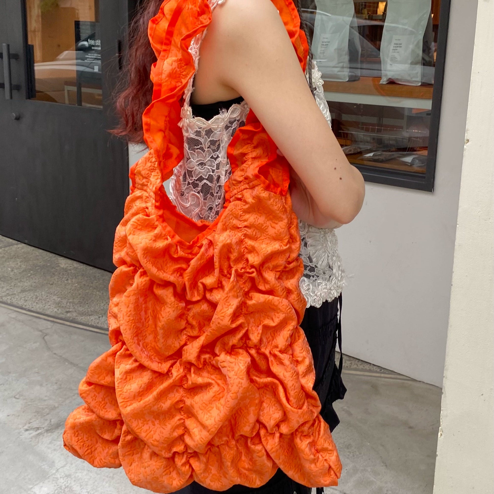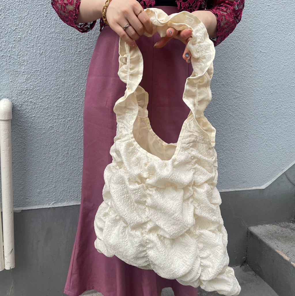 個性が花開く、存在感たっぷりのトートバッグ。繊細なロゼット(花飾り)を思わせるフリルを重ねたデザインが、華やかで遊び心たっぷり♪