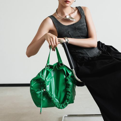 光沢感のあるシャーリングハンドル付きトートバッグ。