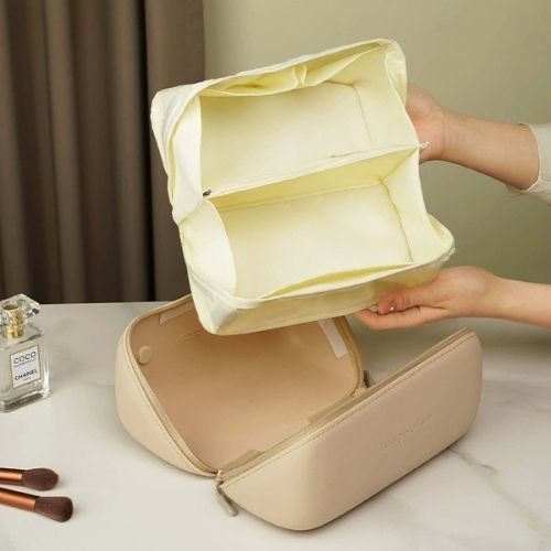 防水・防汚仕様で汚れにくく、軽くて持ち運びやすいのが魅力です。ラウンド型の広々とした開口部で、コスメから小物まできれいに整理整頓。丈夫で型崩れしにくいから、旅行やデイリーユースにも最適です。